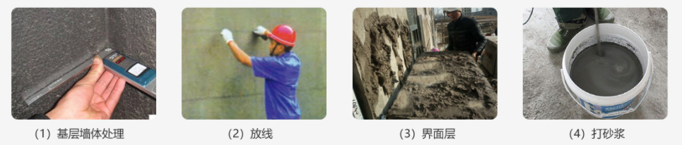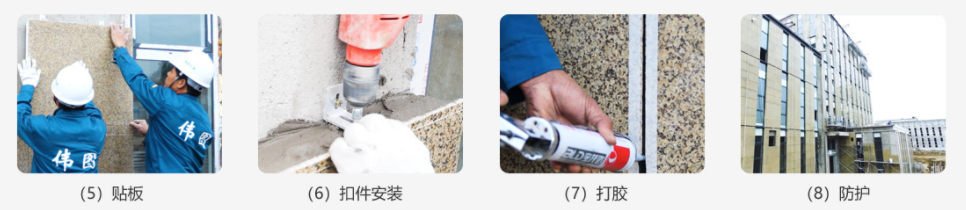 基層檢查→ 基層墻體空鼓、脫落及找平處理→ 彈基準(zhǔn)線和分割→ 粘貼保溫裝飾板→ 用專用扣件錨固裝飾板→ 用保溫泡沫條填縫→ 板縫隙清理→ 貼美紋紙膠帶→ 灌注硅酮耐候型密封膠→ 安裝專用排氣塞→ 撕去美紋紙→ 清潔面板→ 竣工驗收。