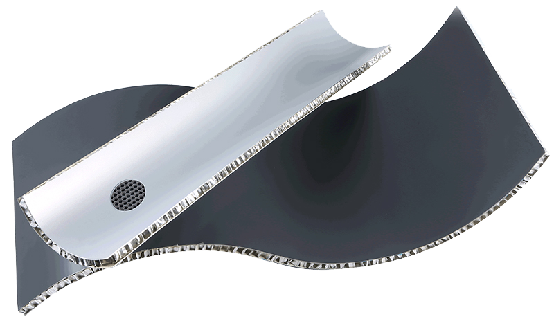 鋁蜂窩板采用氟碳涂層的鋁合金板作為面、背板,以耐腐蝕鋁蜂窩芯作為夾心,雙組份高溫固化聚氨醋為膠粘劑,在專用復(fù)合生產(chǎn)線上經(jīng)加溫、加壓復(fù)合固化而成。鋁蜂窩板為全鋁夾心復(fù)合結(jié)構(gòu),具有比重小,比強(qiáng)度、比剛度高等特點(diǎn),兼具隔音、隔熱功能。