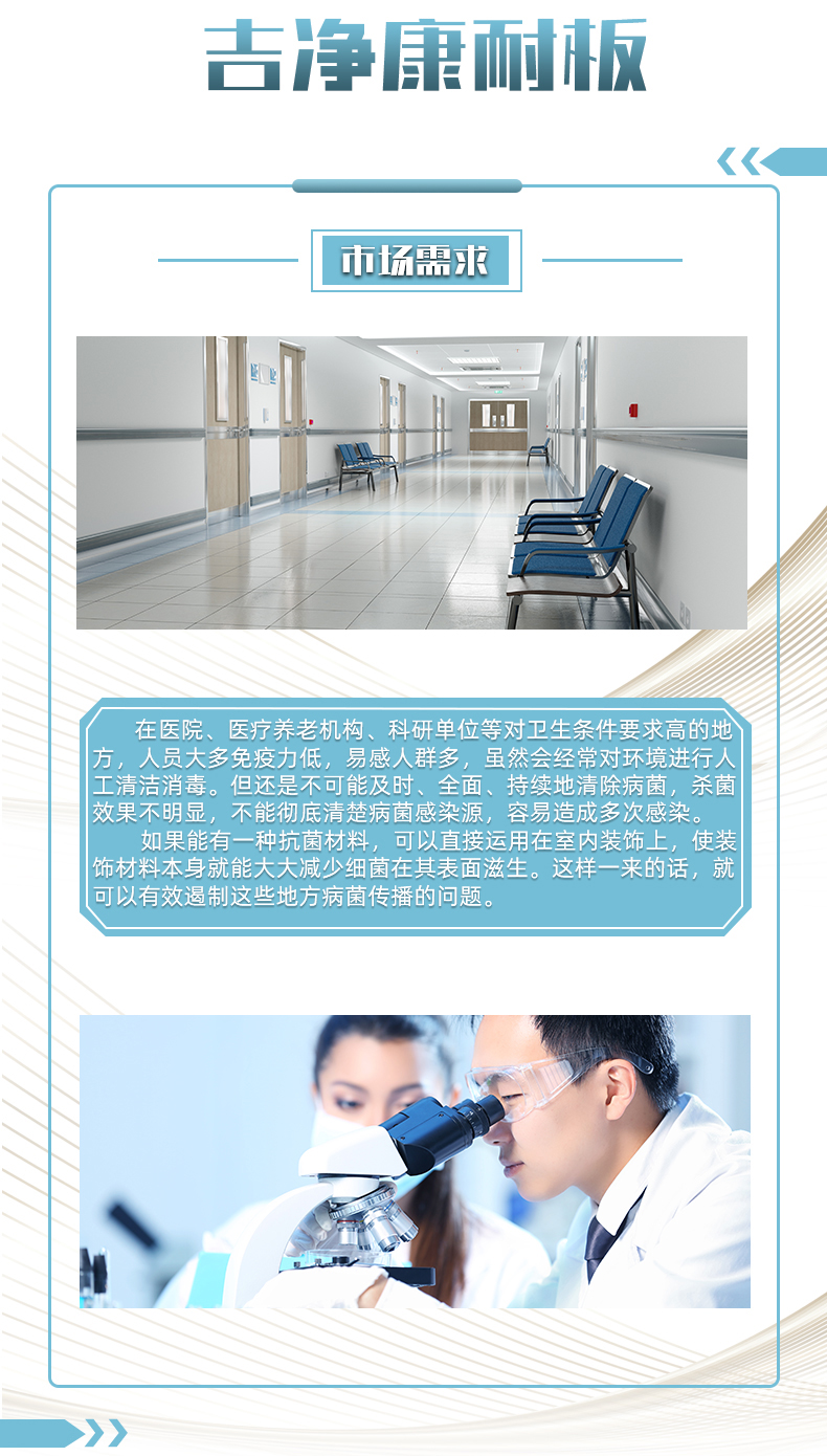 在醫(yī)院、醫(yī)療養(yǎng)老機(jī)構(gòu)、科研單位等對衛(wèi)生條件要求高的地方,人員大多免疫力低,易感人群多,雖然會(huì)經(jīng)常對環(huán)境進(jìn)行人工清潔消毒。但還是不可能及時(shí)、全面、持續(xù)地清除病菌,殺菌效果不明顯,不能徹底清楚病菌感染源,容易造成多次感染。如果能有一種抗菌材料,可以直接運(yùn)用在室內(nèi)裝飾上,使裝飾材料本身就能大大減少細(xì)菌在其表面滋生。這樣一來的話,就可以有效遏制這些地方病菌傳播的問題。