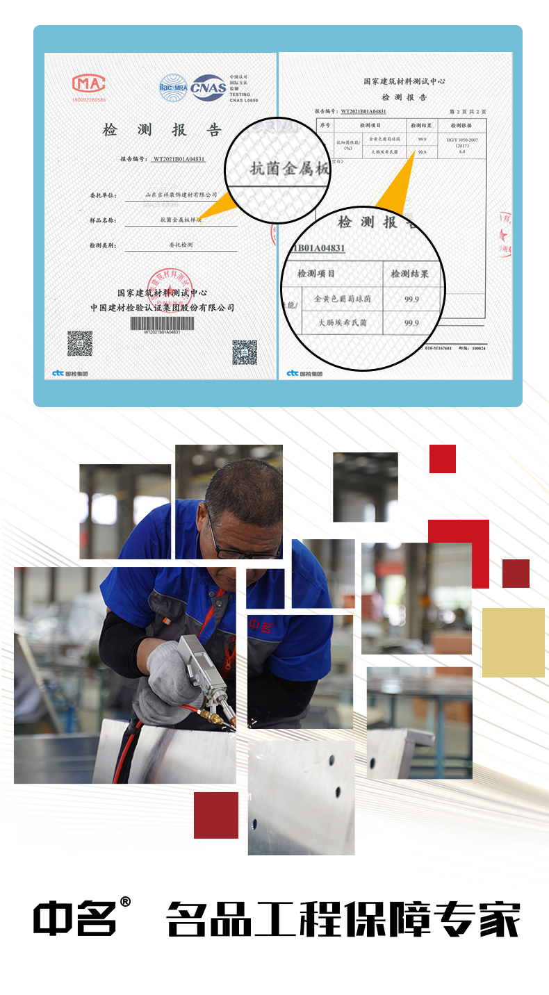 中名集團(tuán)經(jīng)過多年技術(shù)攻關(guān),率先研發(fā)出納米無毒抗菌涂層的吉凈康耐板,它不但具有殺滅細(xì)菌、病毒的功能,而且還具有易清潔、抗磨損等其他優(yōu)異性能。并以此技術(shù)為基礎(chǔ)開發(fā)出了鋁蜂窩板、鋁瓦楞板、鋁單板、金屬復(fù)合板等一系列相關(guān)產(chǎn)品。