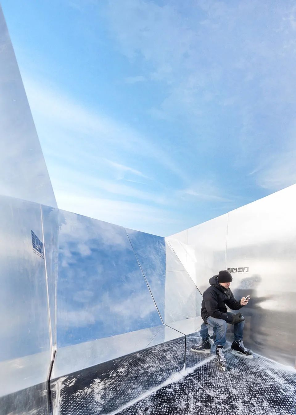 加拿大Skybox裝置使用45度角的鏡面鋁板將天空景象反射到展亭內(nèi),這塊拋光鋁板折疊成與整個展亭寬度相同的長椅。一塊垂直的鏡面鋁板與反射天空的鋁板相對,映射出游客坐在云層之中的影像。
