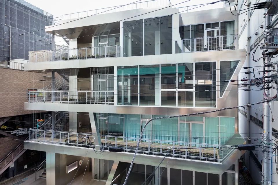 日本SHIKISM商業(yè)綜合體建筑以彩色鏡面鋁板立面融入商業(yè)街,其正面三層陽臺的大小和形狀各不相同,賦予立面變化的效果。陽臺表面采用與立面相同顏色的鋁板,映出建筑內(nèi)外人的活動。