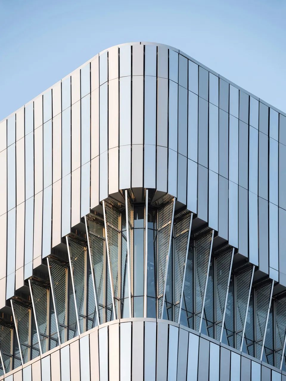 鋁板幕墻采用鏡面和啞光兩種鋁板格柵相間布置,形成強(qiáng)反射與弱反射的交替節(jié)奏,以條帶化的抽象反射將周圍環(huán)境映襯在建筑表皮之上。
