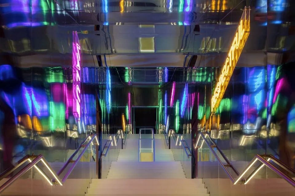 深圳市南頭古城if工廠的大樓梯內(nèi)部,采用了工業(yè)風(fēng)十足的鏡面不銹鋼與充滿活力的霓虹燈標(biāo)牌。