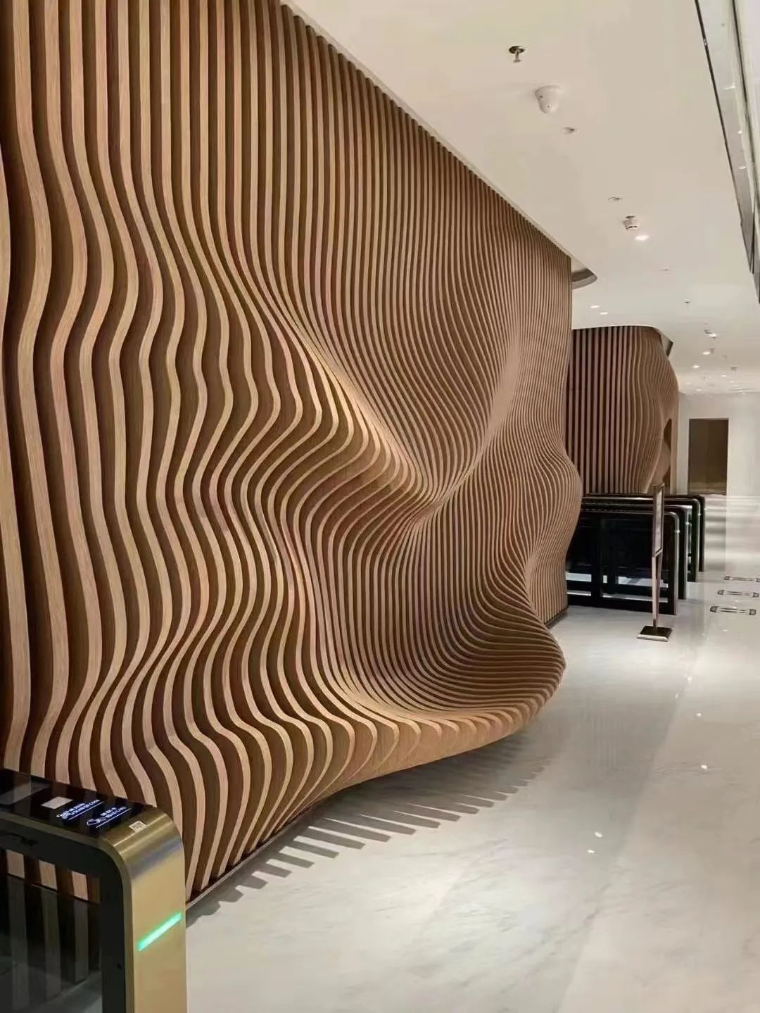 昨天有個客戶咨詢到我,看到我曾經(jīng)做的案例找過來的,江蘇某寫字樓內(nèi)墻和外墻的裝飾,采用鋁單板和鋁方通,外墻用的單曲和雙曲,而室內(nèi)用弧形方通,想用2.0厚的加工,我說不建議,造型板比較多,而且還有雙曲,最低都要2.5,不然沒法達到想要的效果。