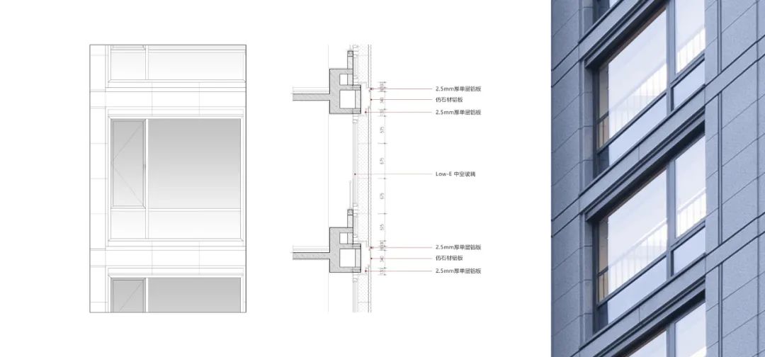 通過滾涂印刷和多次打樣,金麟府選用了效果俱佳、可以假亂真的仿石鋁單板,石材質(zhì)感增添了建筑的細(xì)節(jié)表達(dá)和價(jià)值感,同時(shí)也保證了建筑的整體性。