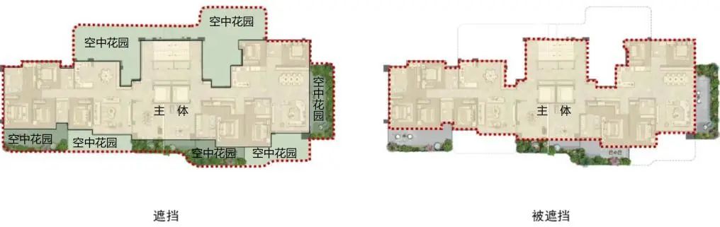 空中花園兼顧上下花園的采光和私密是第四代建筑面臨的一大問題,南側(cè)不宜設置連續(xù)過長的南向空中花園,采用連續(xù)長跑道式空中花園,會對下層采光造成影響巨大,錯落式露臺排布可擴大奇偶層采光面積,科學性的交叉光線設計,讓陽光通過角度射進生活空間,讓采光度與視線寬度都得到增強。