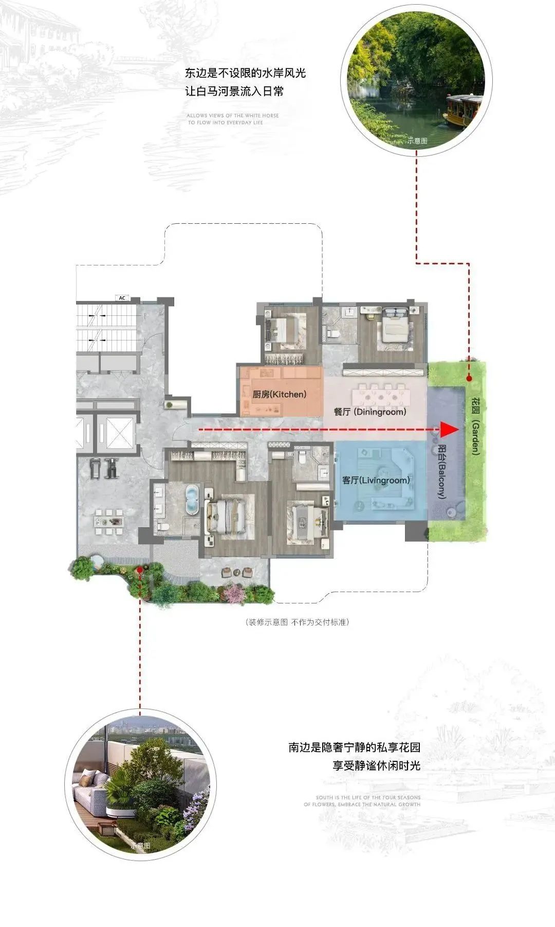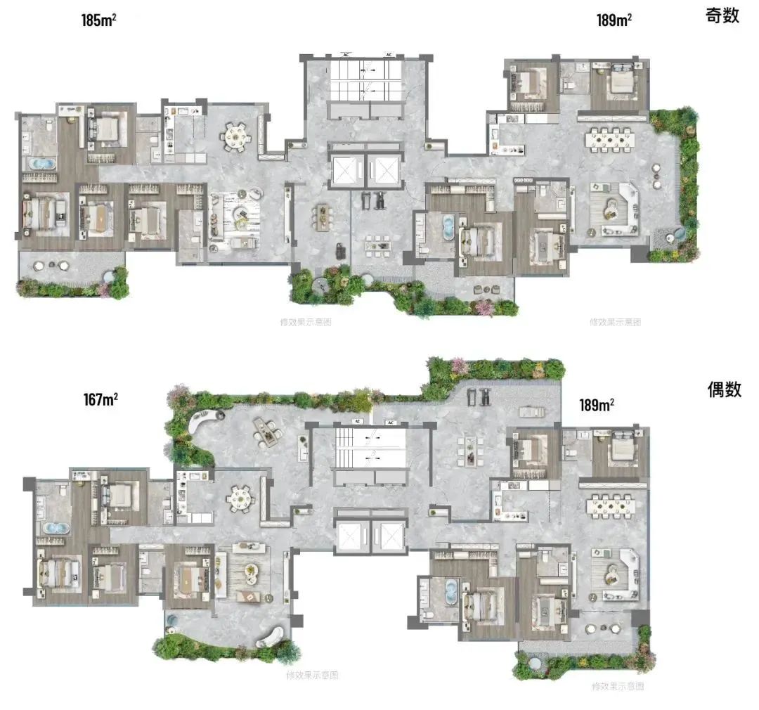 空中花園錯層空中花園是第四代住宅的一大特點,如何做到奇偶層空間平權(quán),不顧此失彼是設計師在規(guī)劃時期設計的重點考量。花園奇偶層設計上遵循平權(quán)主義,做到差異最小化,每層每戶都配備南向空中花園,采用轉(zhuǎn)角廳+空中花園的形式,讓奇偶層空中花園始終圍繞客廳核心功能展開,在露臺設計上均衡戶外戶內(nèi)關(guān)系,最大限度讓出公共空間。