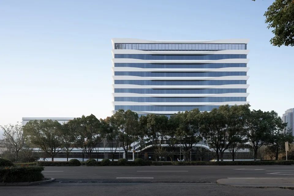 杭州HIS國際學(xué)校主教學(xué)樓的建筑立面通過對(duì)水平線的強(qiáng)調(diào),采用銀白色鋁板和水晶灰玻璃,通過水平方向上的內(nèi)凹折面,形成了極富未來感的現(xiàn)代建筑形象。
