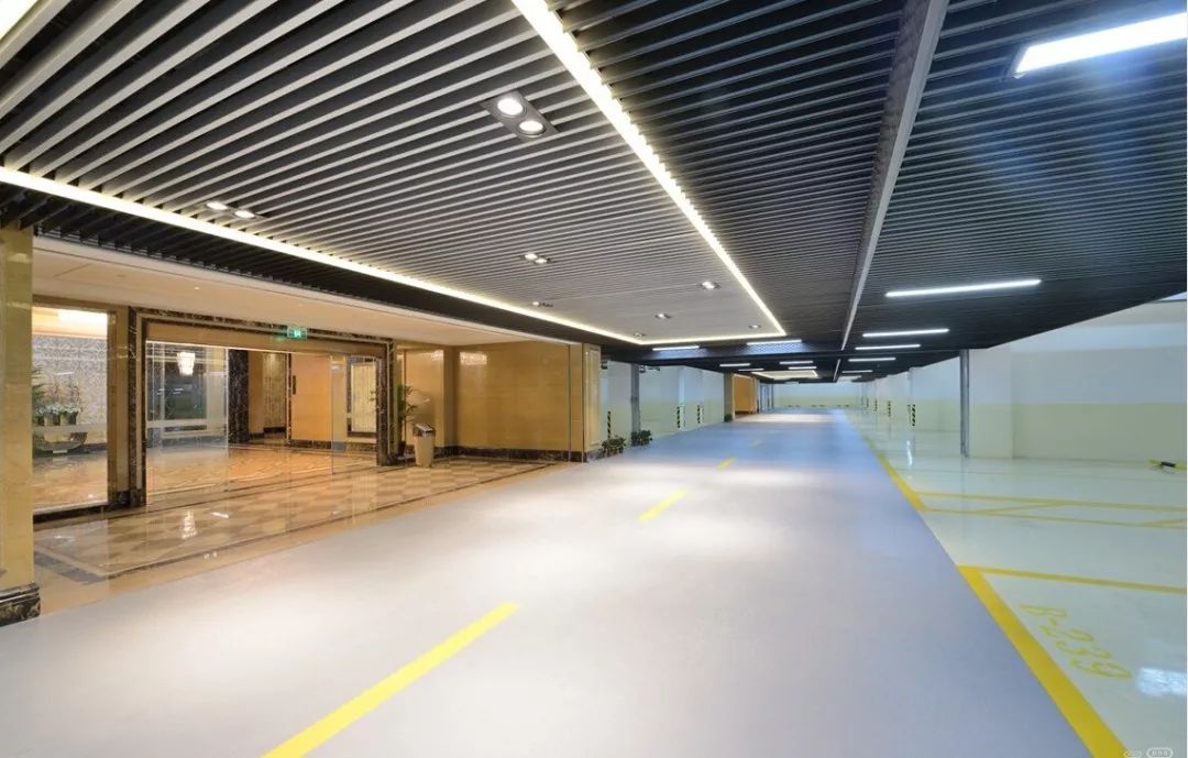 成都人居·九林語項目地下車庫坡道,頂部由金屬矩管吊頂、三條LED照明燈帶鑲嵌其中,質(zhì)感十足。