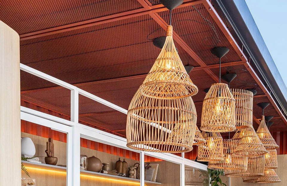 作為裝飾的吊頂在這個市集中主要包括兩部分,一部分是作為氛圍營造和空間界定的木飾面吊頂,另一部分是為了歸整機電設(shè)備的金屬網(wǎng)板吊頂。
