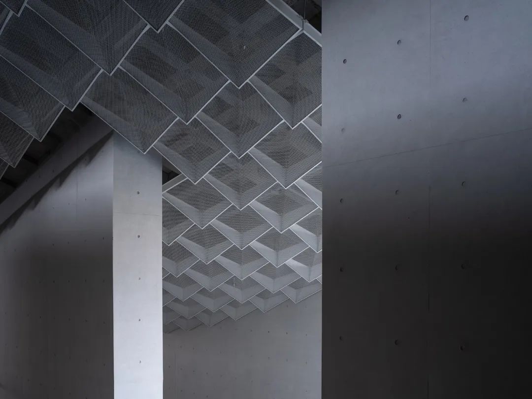 琴臺美術(shù)館柱室內(nèi)屋頂采用了與井格對應(yīng)的、順應(yīng)了曲面的參數(shù)化金屬延展網(wǎng)吊頂。透過半透明的吊頂還是能看到屋頂?shù)慕Y(jié)構(gòu),也遮蔽著其中的機電管線。