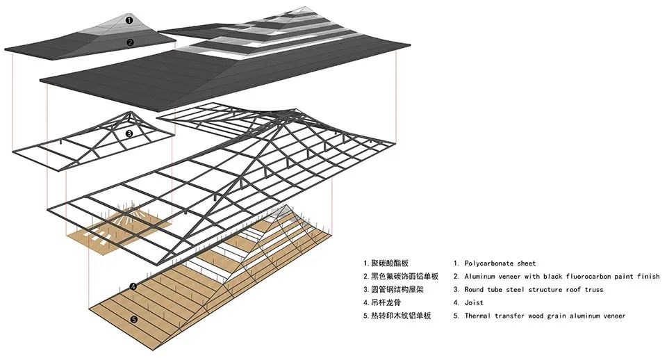崇州·竹藝村游客中心為了強化建筑的竹編文化屬性,竹筍大屋頂?shù)膬?nèi)部結(jié)構(gòu)按照傳統(tǒng)竹編骨架的方式設(shè)計,接待大廳的室內(nèi)吊頂采用長條狀的木色鋁板和半透明聚碳酸酯板編織而成,