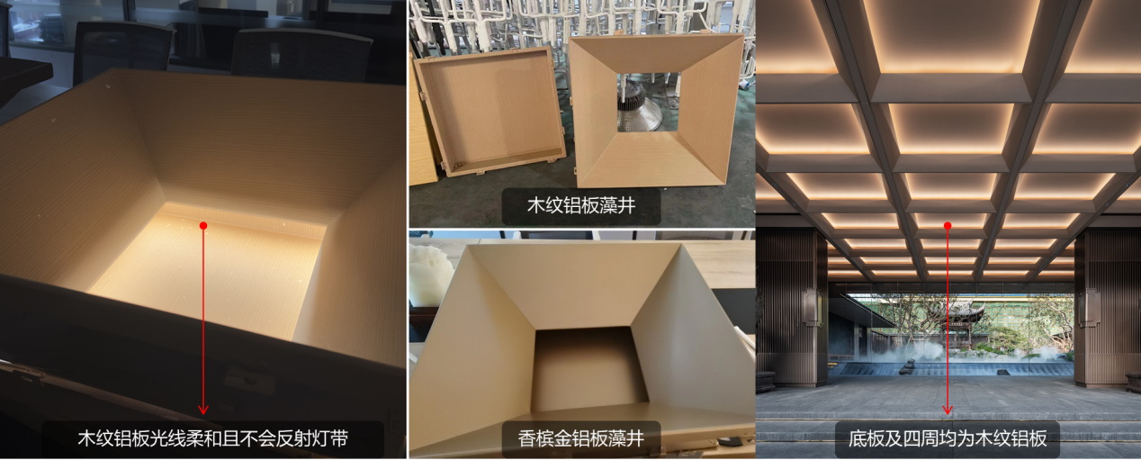 藻井小樣做了木紋鋁和香檳金鋁兩種材質(zhì)的底板和扣板自由搭配,經(jīng)燈光測試最終選用了漫反射的木紋鋁板。