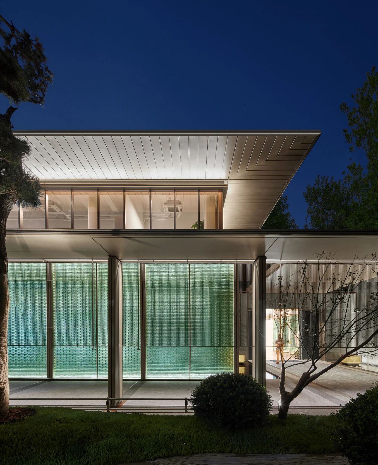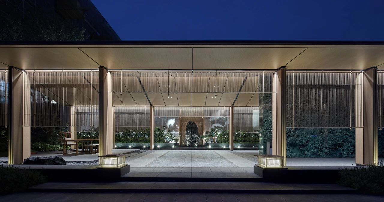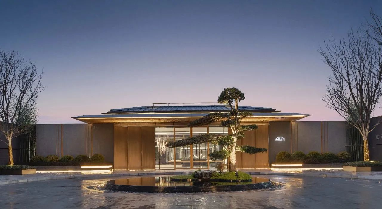 杭州金地·湖頌丹青府立面五脊殿、四坡頂的取意形式推敲造就了丹青閣的建筑語言,其中2.6米外挑檐坡屋面,提取挑檐、鋪?zhàn)鞯裙沤ㄔ?,采取?span style="letter-spacing: 0.034em;color: #D6A841">木紋板結(jié)合藍(lán)黑色金屬瓦的方式,光影流轉(zhuǎn)中,映出了國韻的極簡與現(xiàn)代的輕盈。