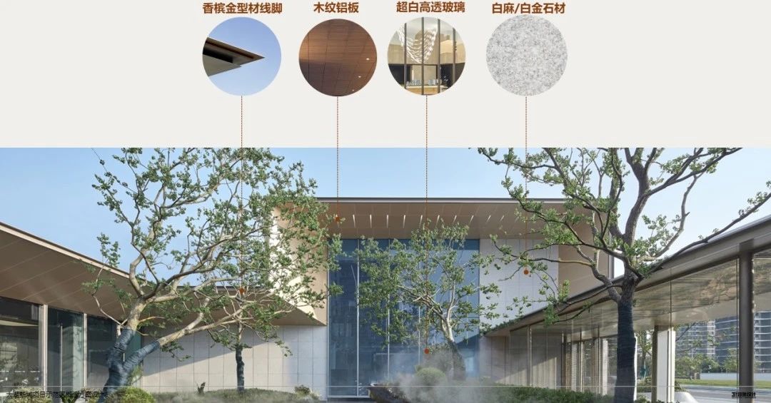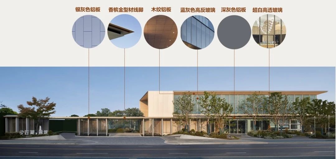 再來看蘇州世紀(jì)金源近湖源筑的立面,無界限的超白玻將室外景致無限引入室內(nèi),淺色系的白金石材搭配木紋鋁板營造輕盈且通透的建筑體量。