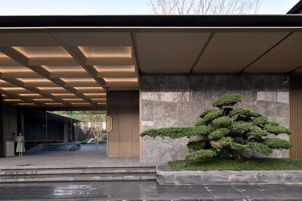 浙江德清鳳鳴和院大門溫暖典雅的仿木鋁板、深邃沉穩(wěn)的型材、溫潤細(xì)膩的藍(lán)眼睛石材,引導(dǎo)人們聯(lián)想起江南書香門第的氣質(zhì)與涵養(yǎng)。