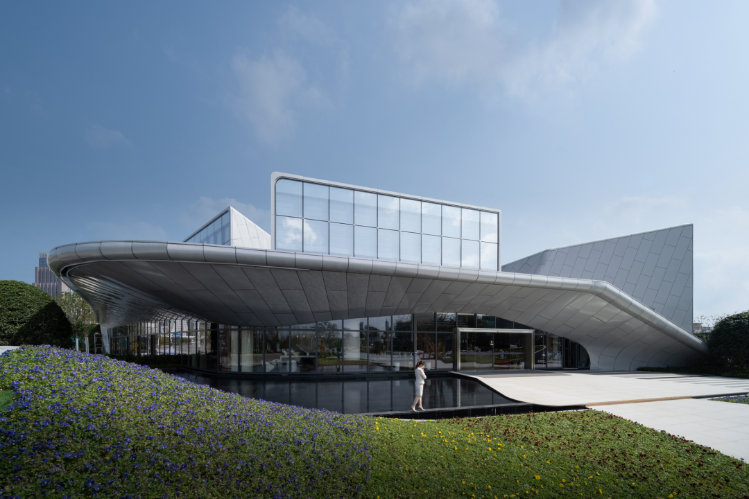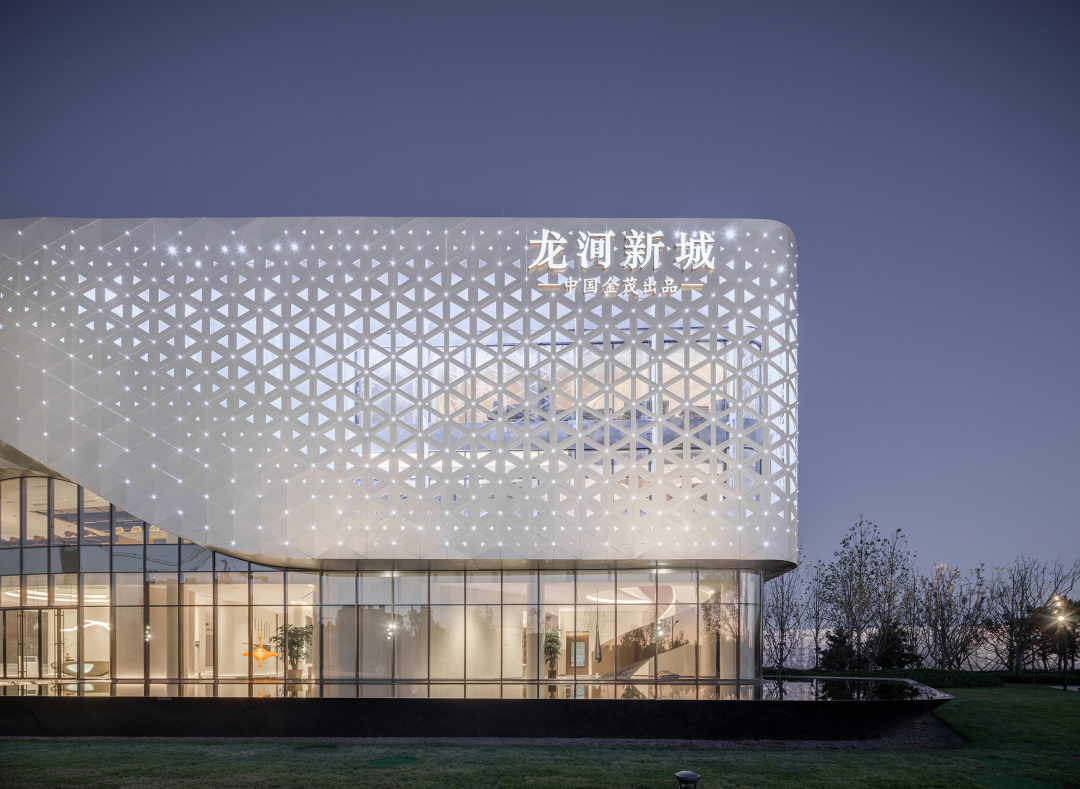 贛州錦潤·濱江云宸展示中心二層的池水平臺,做了具有工藝感的倒角,鋁板具有良好的韌性,設計調(diào)節(jié)二維曲線和三維曲面以達到好的效果,組成雙曲面的鋁板每一塊都不同。