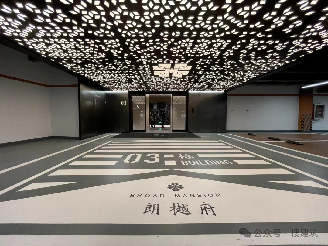 保利·文華的地下車庫實景,單元樓棟出入口通道頂部采用星光金屬吊頂,兩側(cè)貫通燈帶,璀璨燈源和星光燈帶交相輝映。挑高設(shè)計的酒店式歸家大堂,還有全自動智能識別感應(yīng)門。