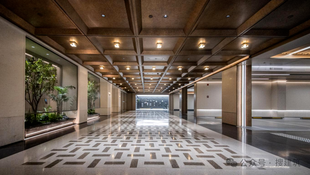 南京金基山川江樾地庫入戶大堂,門口頂面星空頂,仔細看不同角度呈現(xiàn)不一樣的水墨畫既視感,墻面都是大面磚通鋪,整個空間的藝術(shù)感和高級感很強。