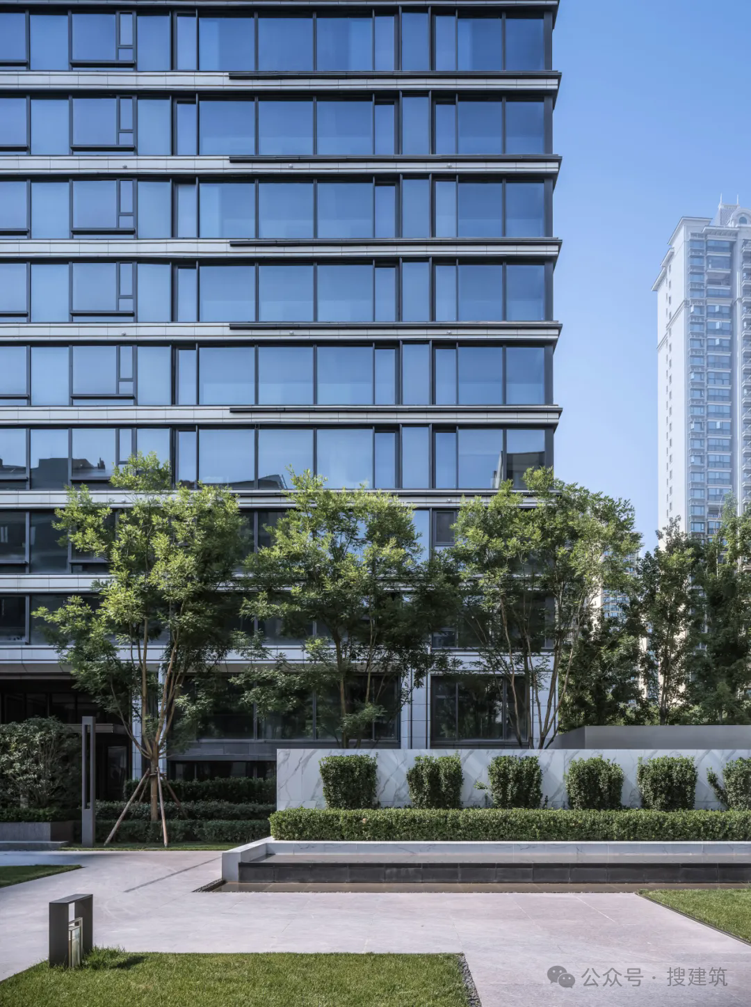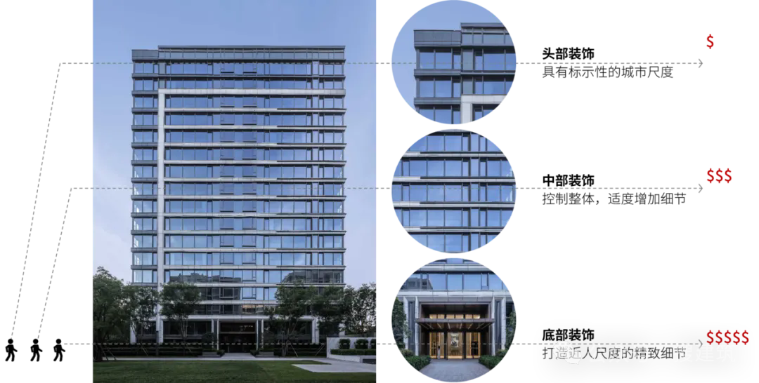 中部標(biāo)準(zhǔn)段打造“普適尺度”,采用仿石材、金屬嵌條等,通過對立面規(guī)律的分縫設(shè)計(jì),提升標(biāo)準(zhǔn)段的品質(zhì)感與設(shè)計(jì)感,同時提升材料的耐久度與平整度。