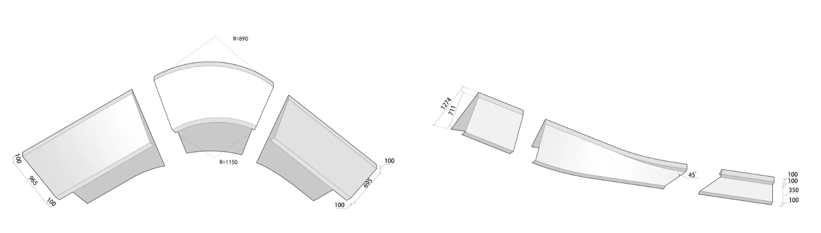 設(shè)計團(tuán)隊通過模數(shù)控制對構(gòu)件進(jìn)行梳理:玻璃欄板,扶手,鋁板等不同材料進(jìn)行對縫設(shè)計,玻璃欄板劃分間距1.5m,一塊玻璃欄板對應(yīng)一塊鋁板,進(jìn)行標(biāo)準(zhǔn)化設(shè)計;調(diào)板弧線尺寸、弧面玻璃倒角尺寸進(jìn)行統(tǒng)一,弧形挑板被進(jìn)一步拆解為,收邊型材,上斜面,下斜面,弧形轉(zhuǎn)角等構(gòu)件,進(jìn)行模塊化分解。