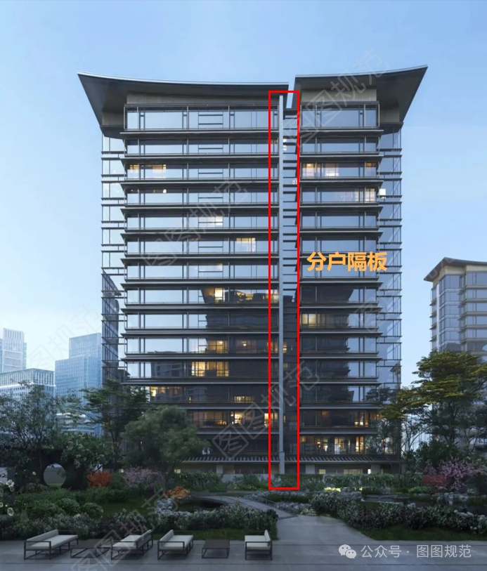 相鄰戶外窗之間設(shè)置寬度不小于1.0m的不燃性墻體,用玻璃包裹住分戶實(shí)體墻,既滿足規(guī)范,又達(dá)到了玻璃立面橫向的連續(xù)性。