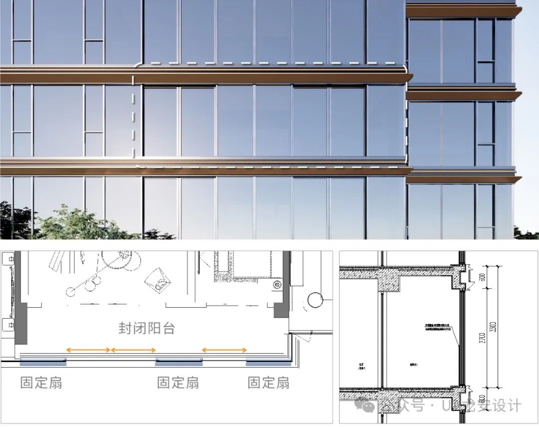 做法原理:用防火玻璃墻替換實(shí)體墻,且無(wú)需考慮欄桿防護(hù),既通透,又玻璃幕墻感效果好。