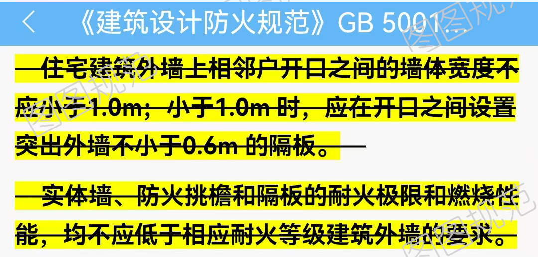 6.2.3 住宅建筑外墻上相鄰套房開(kāi)口之間的水平距離或防火措施應(yīng)滿足防止火災(zāi)通過(guò)相鄰開(kāi)口蔓延的要求。