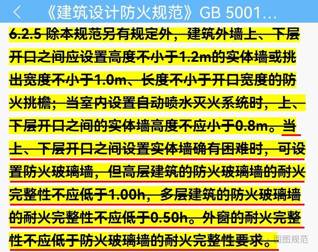 分戶墻防火措施,水平方向要求相對(duì)于豎向方向要求要低,在《建筑設(shè)計(jì)防火規(guī)范》 6.2.5條文說(shuō)明中也有明確解析: