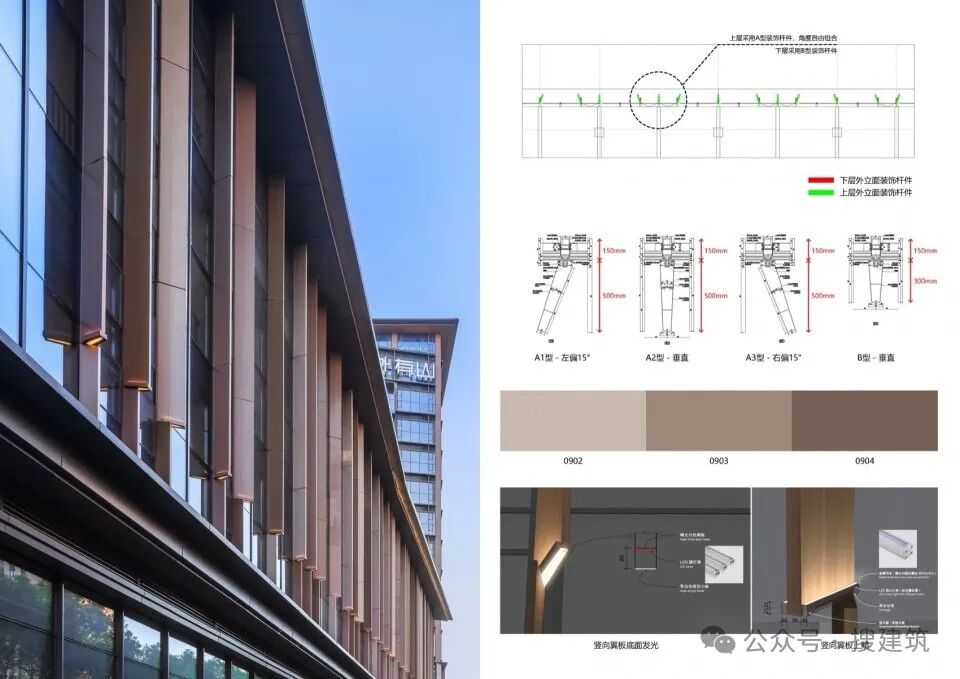 比如常州山外有山公寓&集市綜合體項(xiàng)目裙房氟碳噴涂仿木鋁板百葉被分為成三種角度,左偏15°、右偏15°以及垂直于玻璃面,并排列刻畫出山丘剪影。