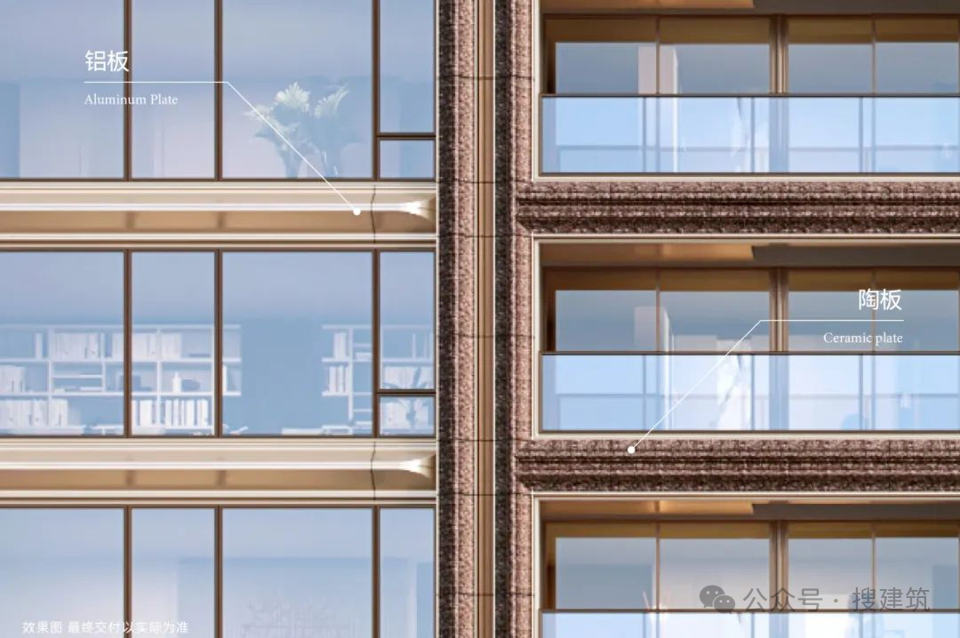 中建·玖上瑯宸的建筑外立面設(shè)計汲取豫園“金聲玉振”靈感,部分選用約1150℃高溫?zé)贫删暗骆?zhèn)稀有陶板,打造“金鑲玉制”的海派先鋒立面,搭配石材與鋁板,讓室內(nèi)外景致無界交融。