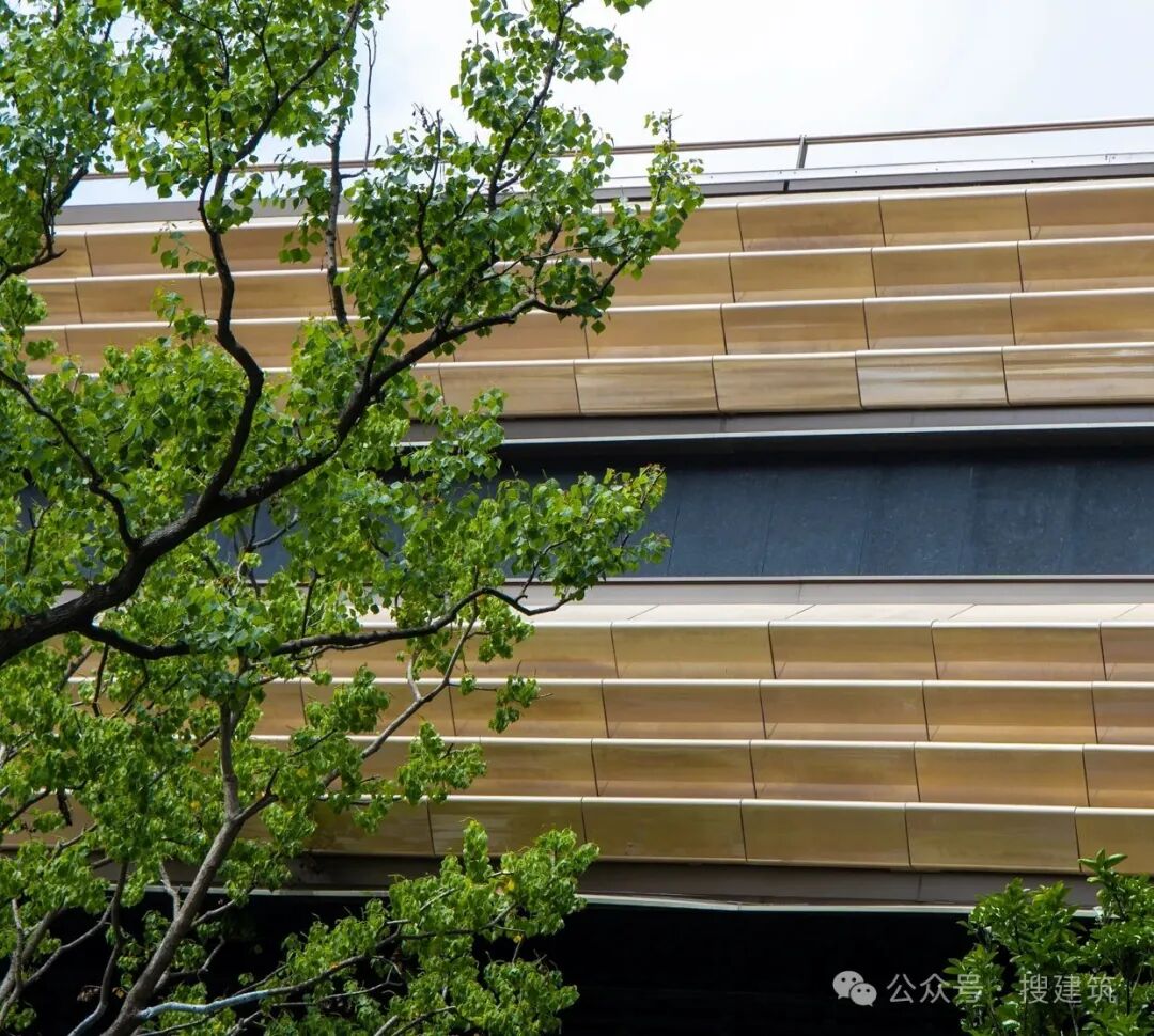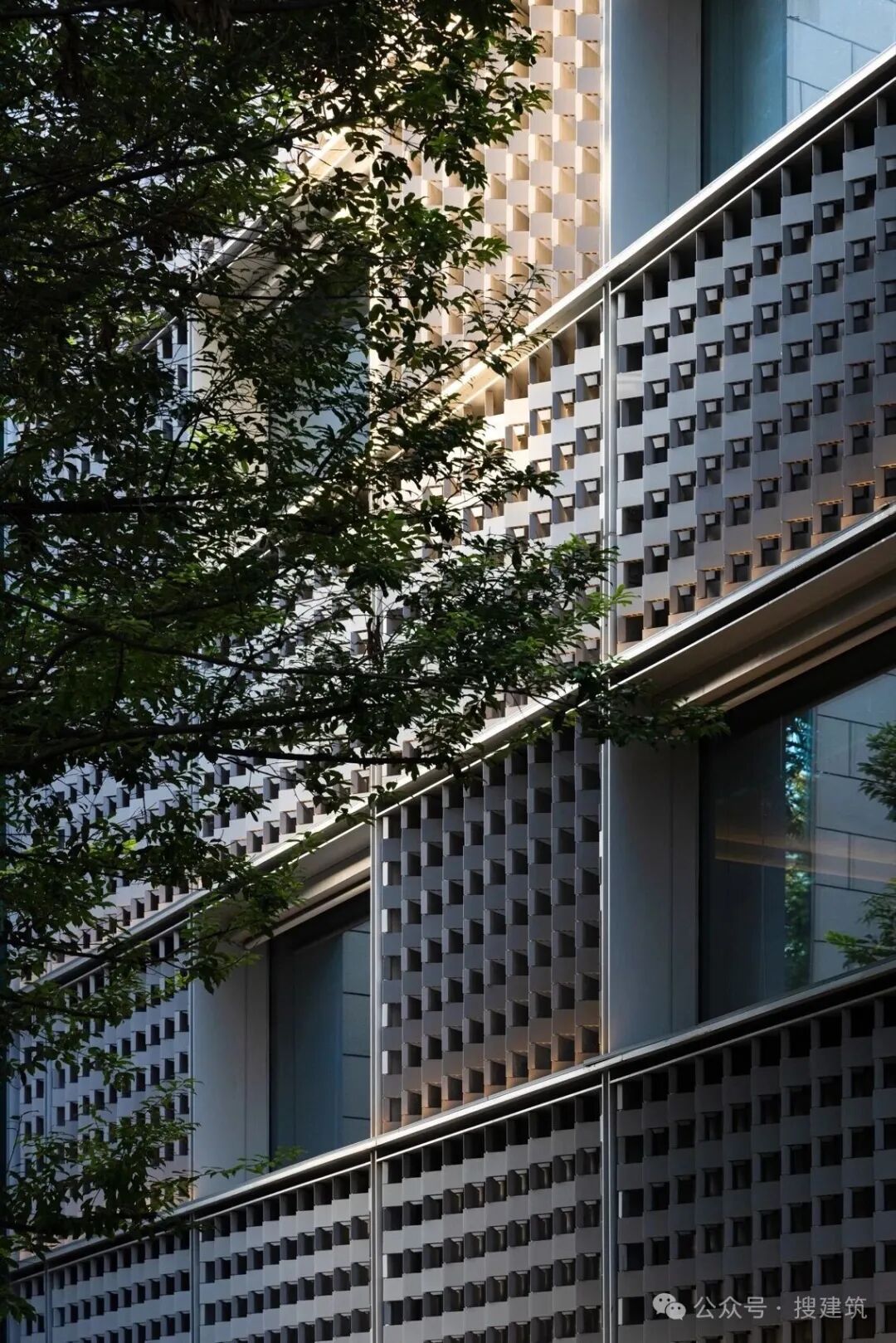 陶板的光影變化,比鋁板更豐富;陶板的質(zhì)感,比石材靈動。橫向鑲嵌在外立面的陶板,起到了重要作用,它讓整個建筑更溫潤,更靈動——它像愛馬仕的斜紋縫線一樣,起到的是點睛之筆的作用。