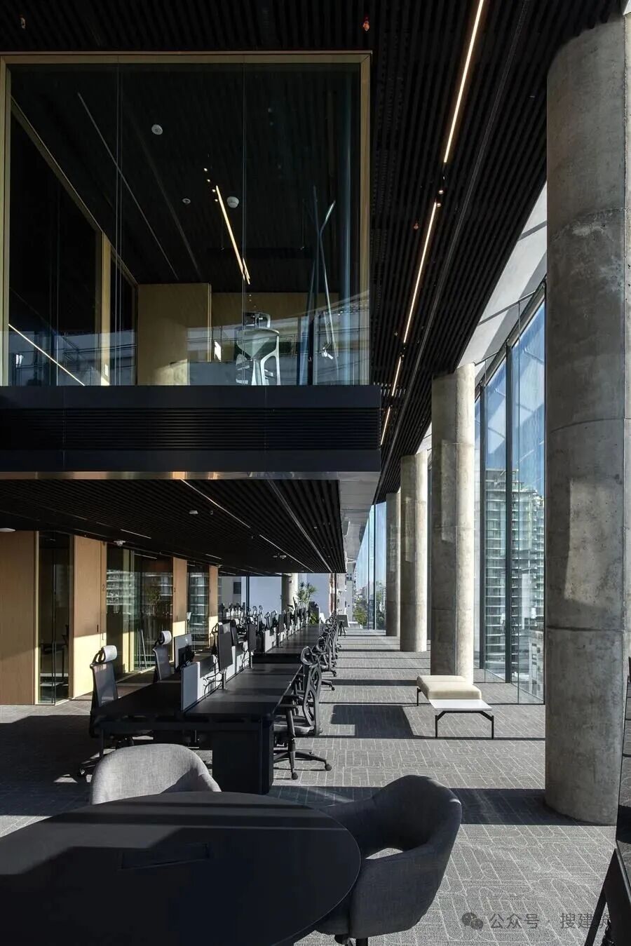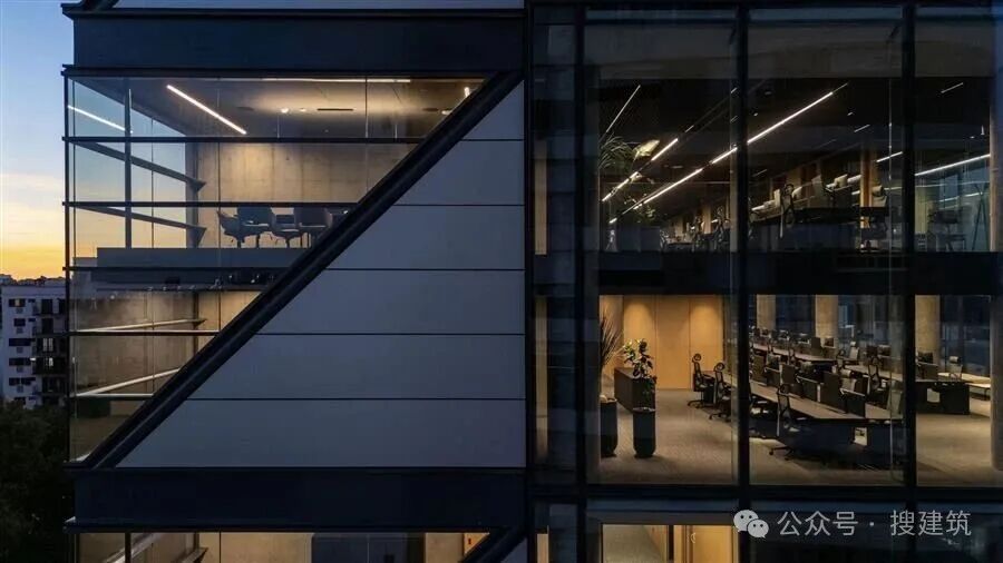 該建筑的混合結(jié)構(gòu)包括一個傳統(tǒng)的混凝土建筑(核心、柱和板)和一個兩層的模塊,創(chuàng)造了間隙層。一個雕塑般的、透明的剪刀樓梯解放了核心,鼓勵連接和互動。帶有懸浮夾層的雙高系統(tǒng)創(chuàng)造了中間層次,最大限度地提高了可用面積,并產(chǎn)生了靈活和空間變化的樓板。