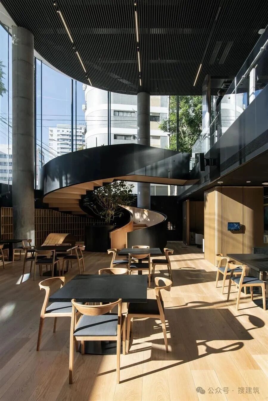 在街道層面,塔樓與城市緊密相連,其三層高的基地被設(shè)想為城市溫室,設(shè)計用于容納餐廳和其他公共用途。一個寬闊的懸臂式螺旋樓梯從街道入口下降到較低的公共層,在城市和建筑內(nèi)部之間建立了強大的視覺和空間聯(lián)系。員工設(shè)施包括一個屋頂露臺與城市和河景,自行車架,更衣室,和淋浴。