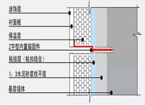 粘錨結(jié)合式主要是根據(jù)施工要求,保溫裝飾板的外墻外保溫系統(tǒng)采用粘接和錨固相結(jié)合的方式,將保溫裝飾板固定在基層墻體上。結(jié)合了完全粘結(jié)式和干掛的優(yōu)勢,被廣泛應(yīng)用在工程上。