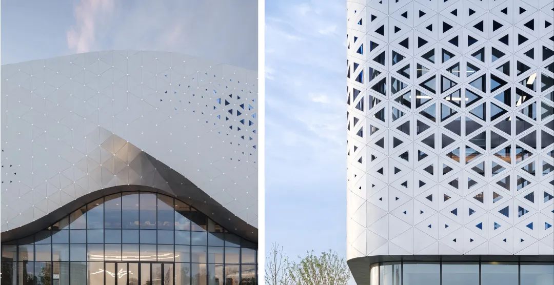 廊坊金茂龍河時代城市客廳外立面通過雙曲鋁板、穿孔板以及底層超白玻的材質(zhì)組合,既凸顯了建筑的雕塑感和現(xiàn)代感,又確保了視線的通透性和與景觀的互動性。