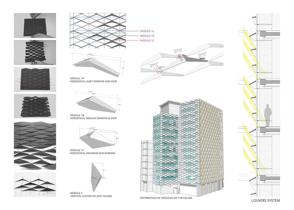 這些菱形百葉巧妙地與白天的太陽運動軌跡相關(guān)聯(lián),以此幫助建筑控制內(nèi)部的溫度,并減少了對能源密集型人工冷卻的需求。