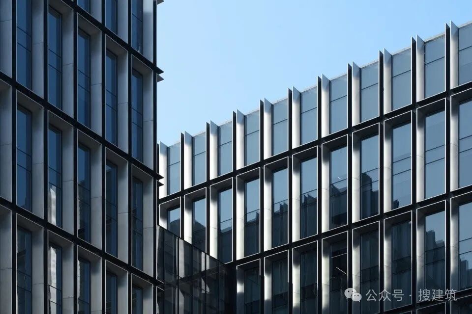 幕墻單元內(nèi)設(shè)置布紋不銹鋼與深色鋁板組合的遮陽框。布紋鋼板對光線的漫反謝性能優(yōu)于常規(guī)的氟碳噴涂鋁板,無論是北側(cè)背陰處,還是陰雨,晴空,都能有細(xì)膩的朦朦朧反射效果,令人感受到,細(xì)節(jié)的精致。