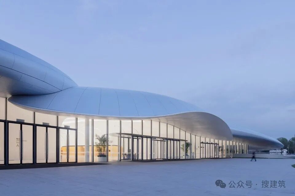 夜晚,隱匿于屋面百葉板縫間的燈光與屋面線條同步舒展,動(dòng)靜相宜、相映成趣,既呼應(yīng)著城市主干道川流不息的車流,也為城市增添了活力與動(dòng)力。