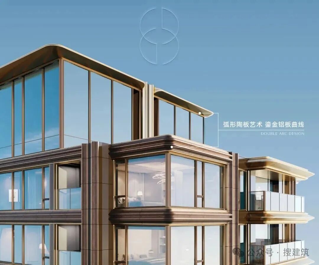 中建·玖上瑯宸的建筑外立面設(shè)計汲取豫園“金聲玉振”靈感,部分選用約1150℃高溫?zé)贫删暗骆?zhèn)稀有陶板,打造“金鑲玉制”的海派先鋒立面,搭配石材與鋁板,讓室內(nèi)外景致無界交融。