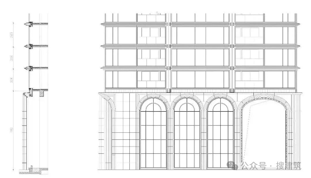 項目外立面極具特色,通過仿石鋁板打造出九層立體疊級折面,形成豐富的光影韻律。立面精選貝金米黃石材、寶格麗綠奢石等材質(zhì),自約11.5米高的石材基座向上延伸,融入古典拱券元素,奠定莊重基調(diào)。中部仿石鋁板與玻璃幕墻交織,頂部以輕盈穹頂收束,整體呈現(xiàn)剛?cè)岵囊曈X效果。