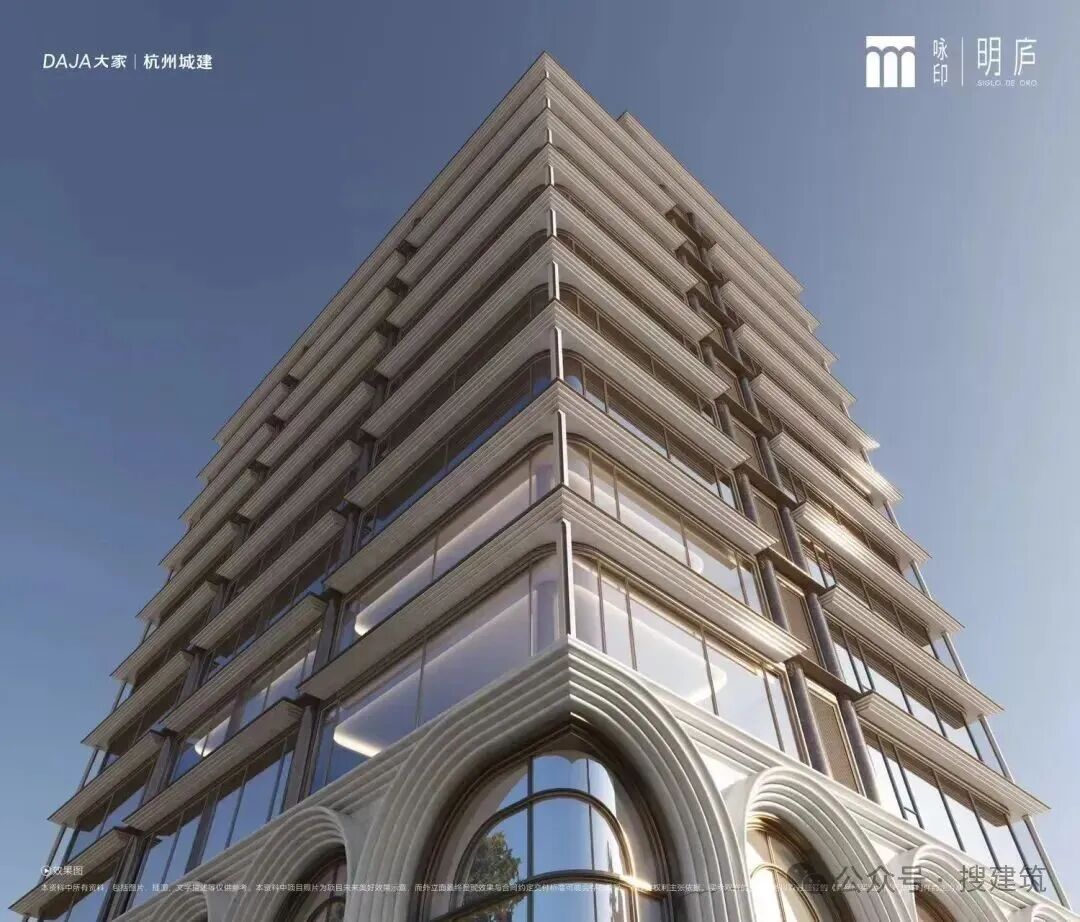 比如,杭州建發(fā)招商·元序,由line+聯(lián)合創(chuàng)始人、主持建筑師孟凡浩執(zhí)筆,公建化立面以全玻璃幕墻為基底,搭配仿石鋁板、釉面陶板等高端用材,并融合宋瓷溫潤質(zhì)感與未來主義曲線設(shè)計,精工打造“超流體屏”,科技感與現(xiàn)代感十足。白色陶板大筆觸勾勒, 塑造出如竹節(jié)般向上生長的建筑群。