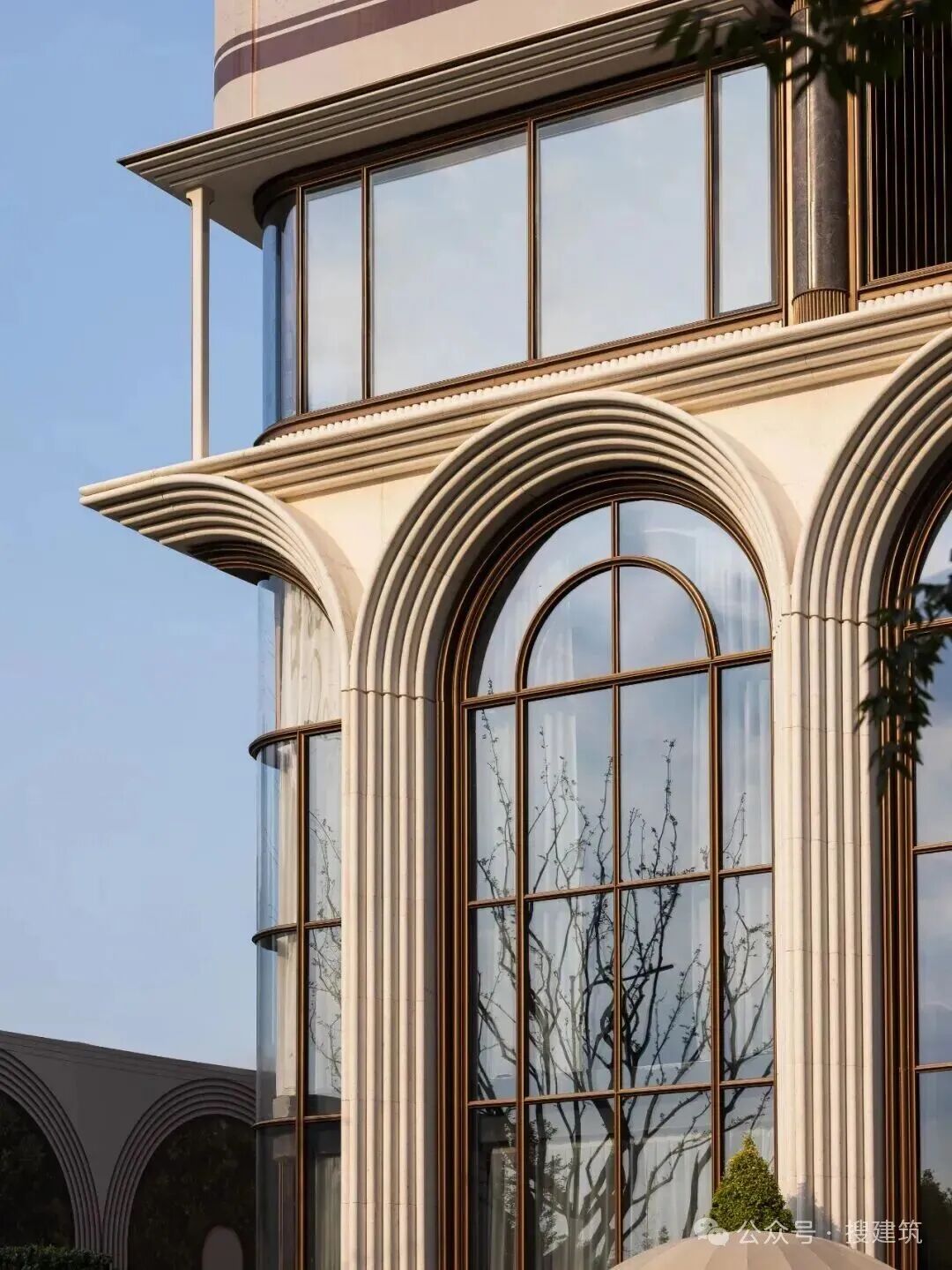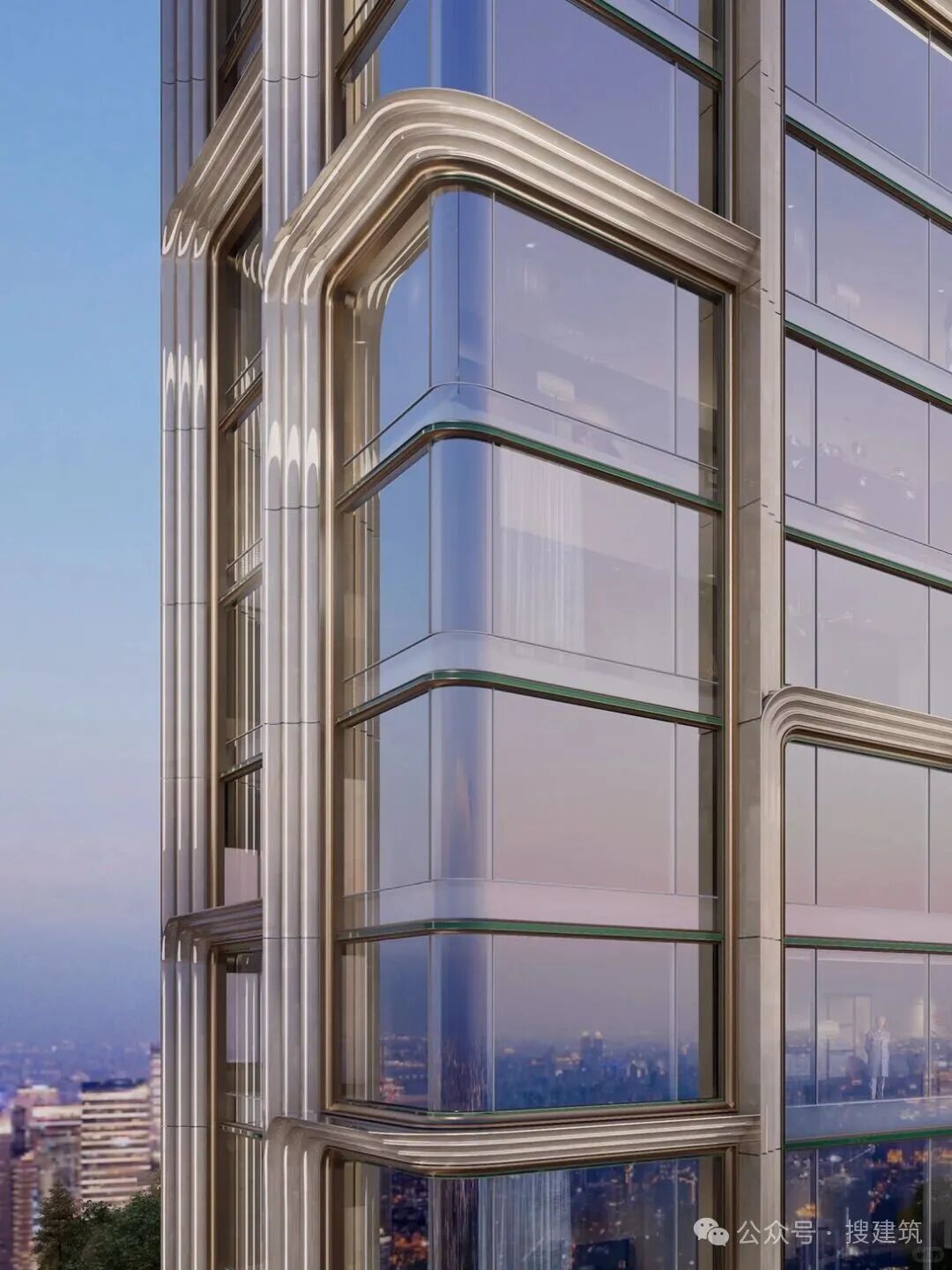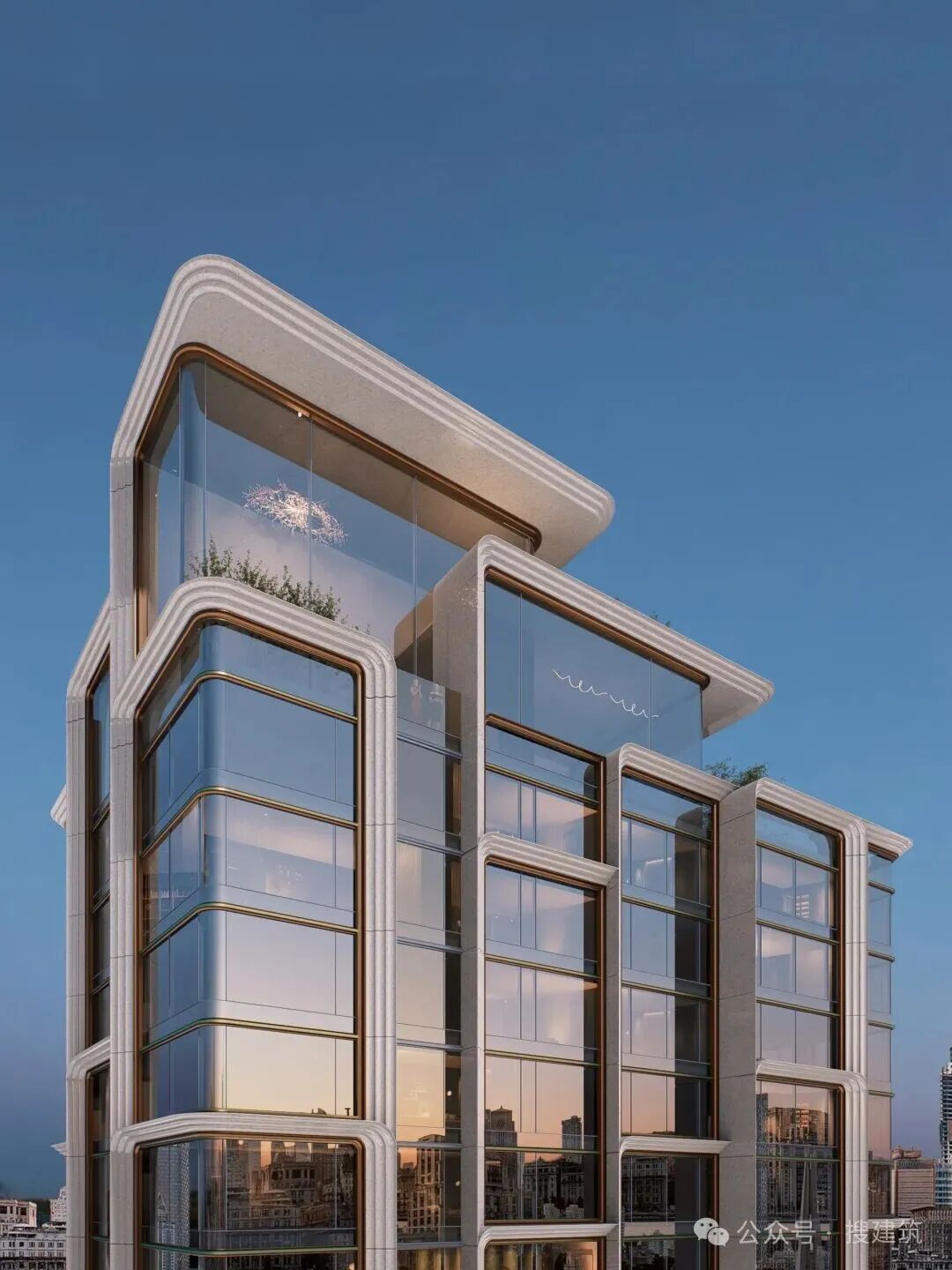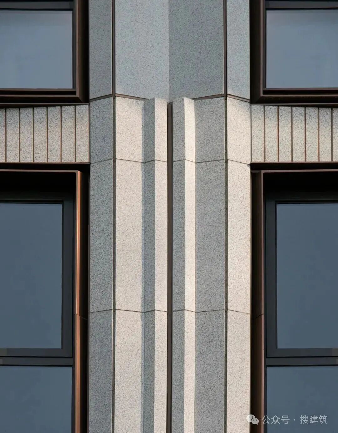 建筑創(chuàng)新地將東方坡屋頂意象融入高層形態(tài),以中央古銅色金屬挑檐為核心,向上下對稱疊退,構(gòu)成獨特的“鏡像坡屋頂”。檐間巧妙嵌入三段式羅馬柱,深色石材柱體與金屬檐口精密咬合,豎向勾勒于玻璃幕墻之中。斯卡帕疊級的中式挑檐與經(jīng)典羅馬柱交織對話,兼收東方婉約意蘊與西方挺拔力量,成就立面的幾何美學(xué)深度。