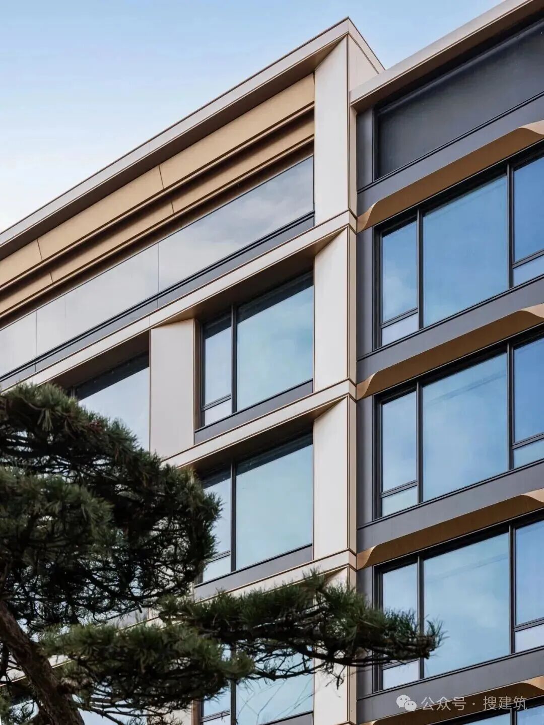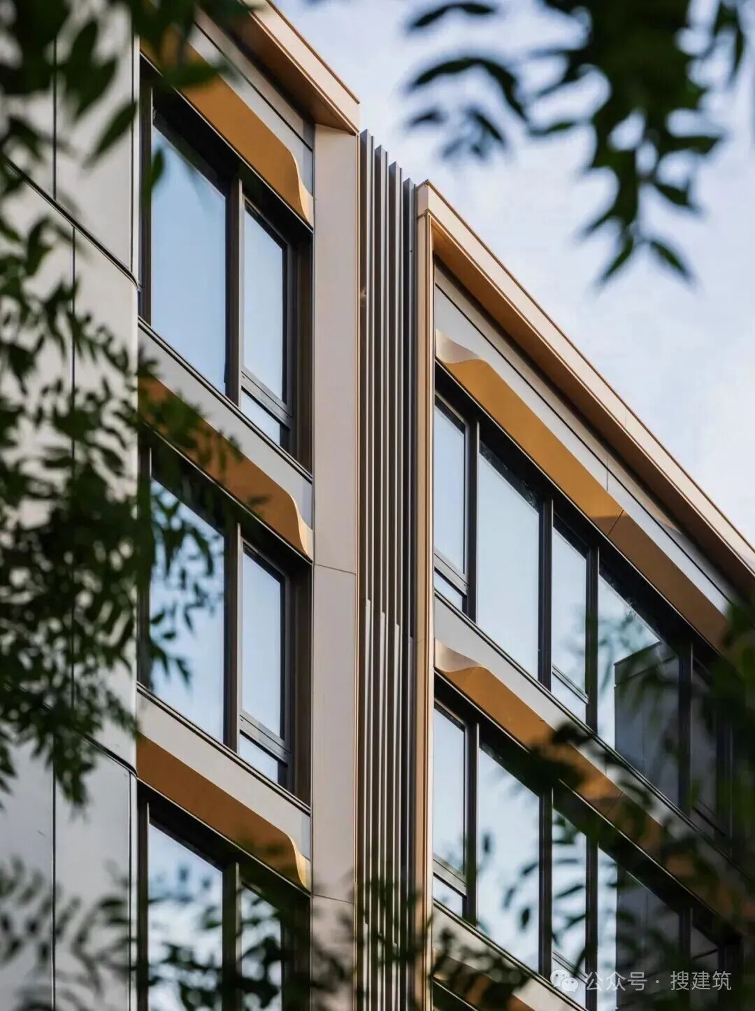 鋁板間嵌以仿銅香檳金鋁板及深灰色線條鋁板,形成三段式比例分割,層次豐富而和諧。