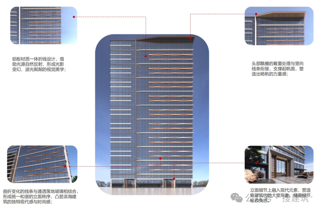 在細節(jié)的處理,中駿·天禧更顯高級格調(diào)。折角處做了鋁板和全屏落地窗質(zhì)感過渡,頭部飄檐的著重處理與豎向線條銜接,塑造船帆的力量感,典雅簡約,精奢細節(jié);輔以鋁板一體化折線工藝,制作約8m依舊平整,提升建筑的現(xiàn)代感、時尚感與品質(zhì)感。